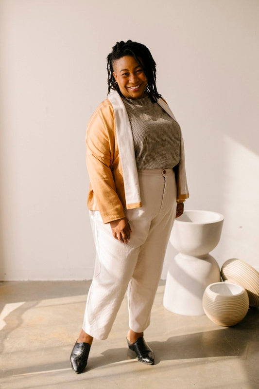 Arched piecing at the back and a contrast fold-over collar create interest and depth. The oversized patch pockets add a cozy element. In brushed cotton twill (exceptional for it’s supersoft texture and wool-like feel), the Uma Jacket is warm and sculptural.