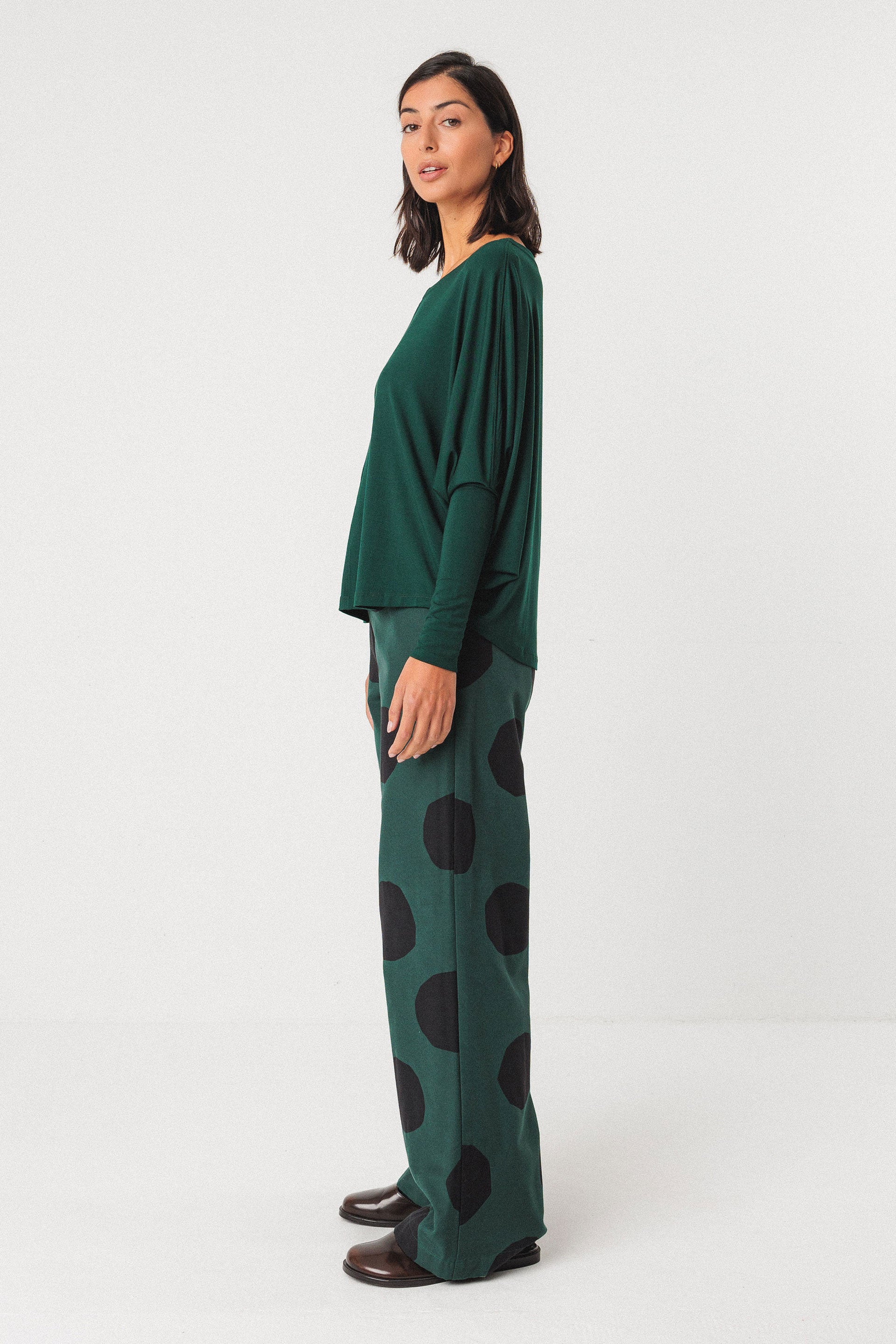 Super soft, loose-fitting boat neck top with batwing sleeves and stretchy, fitted forearms.